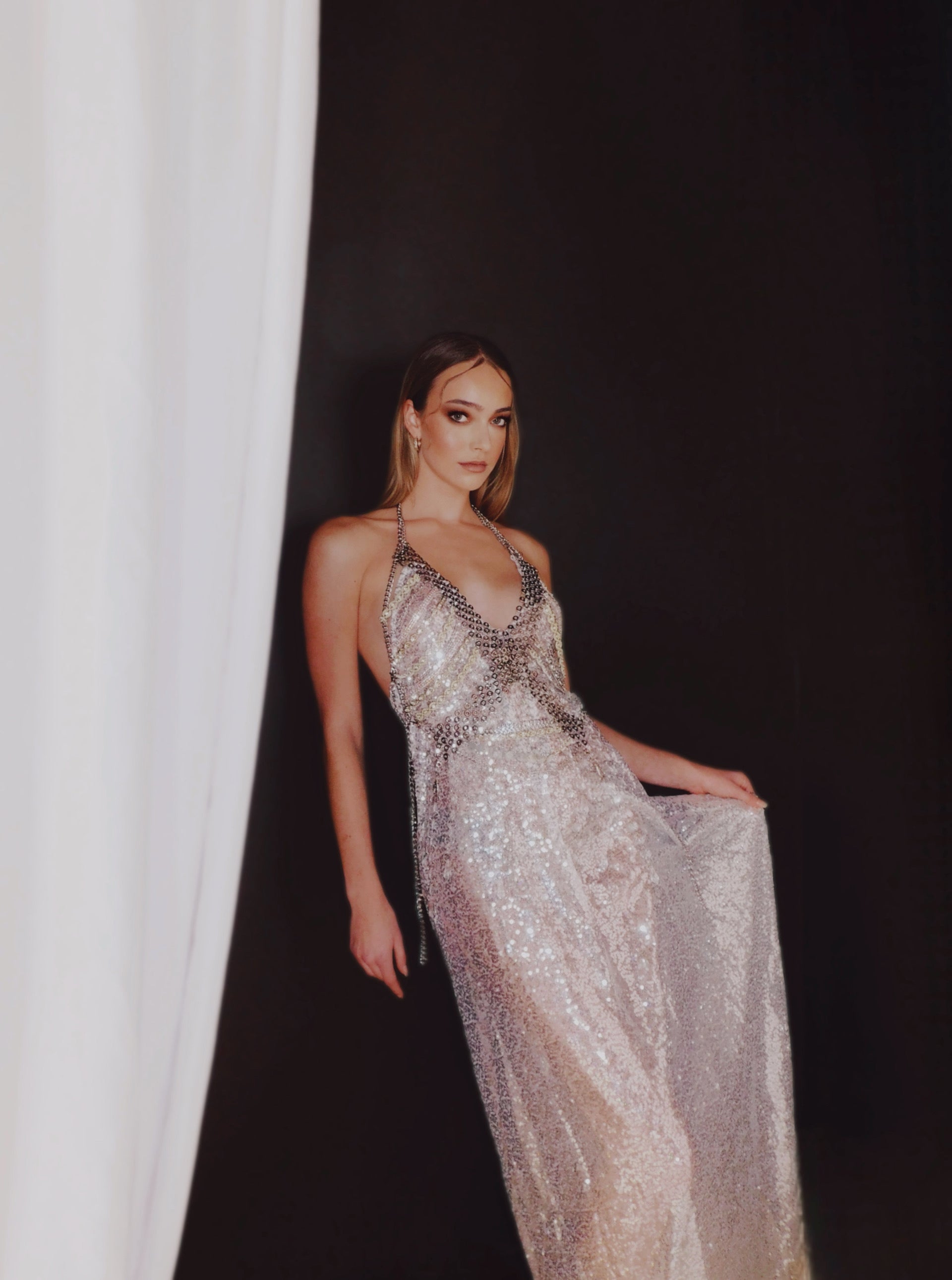 Introducing my masterpiece- The Chandelier Dress. Handcrafted with vintage necklaces, chain link, and crystal chandelier hangings, this icy sequin gown is truly one-of-a-kind. Featuring a halter style neckline and low back, this dress exudes elegance and exclusivity.